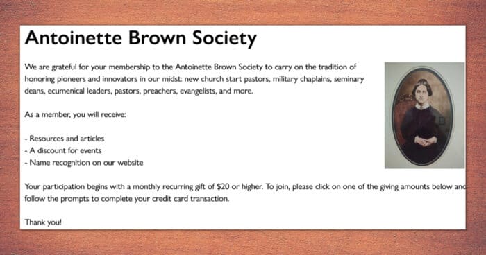The Antoinette Brown Society is launching a one-week membership drive to support the gifts of women in ministry in the United Church of Christ.