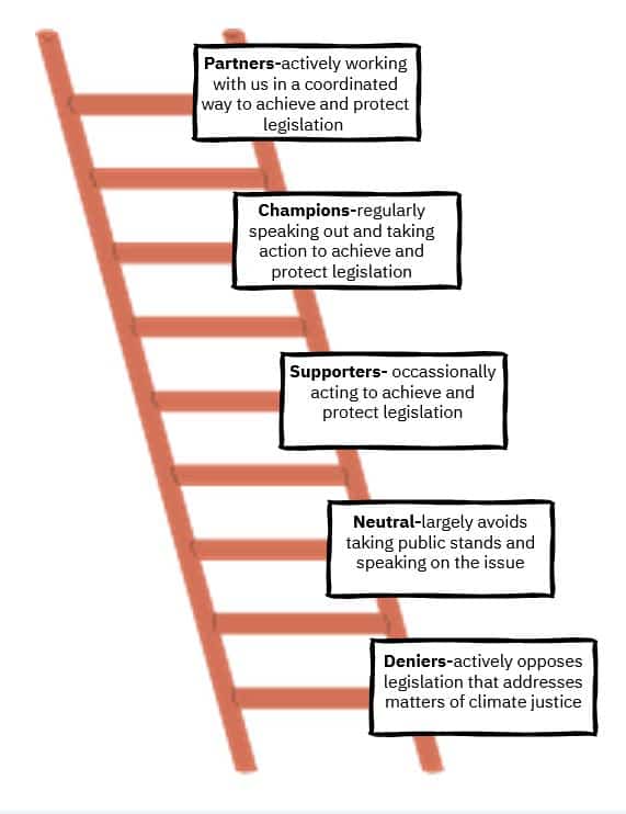 We can visualize members of Congress as being on a ladder that extends from climate deniers at the bottom to climate justice champions and partners at the top. Most members of Congress are not climate justice champions, and our aim is to use the power of our relationships with them to move them higher on the ladder.