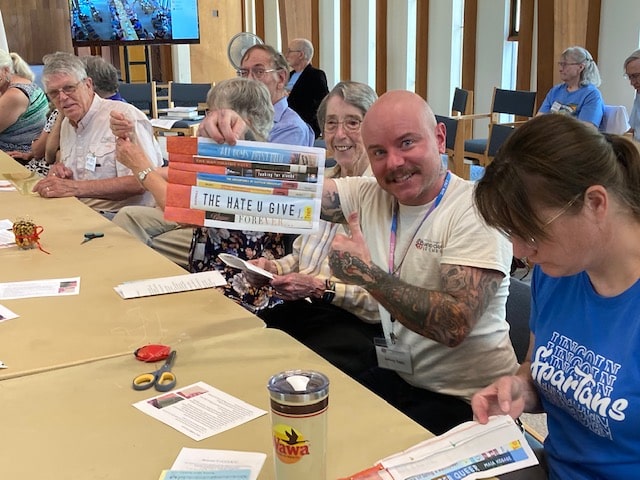Lisa Carloye responded with the idea for attendees to collectively create a quilt as part of worship based around the topic of book bans that have risen around the country in the past two years. Book bans rose nearly 40% in 2022 over the previous year, and the vast majority of targeted books feature LGBTQ+ characters or characters of color, or topics related to racism, LGBTQ+ identities and sex education, according to data from PEN America.