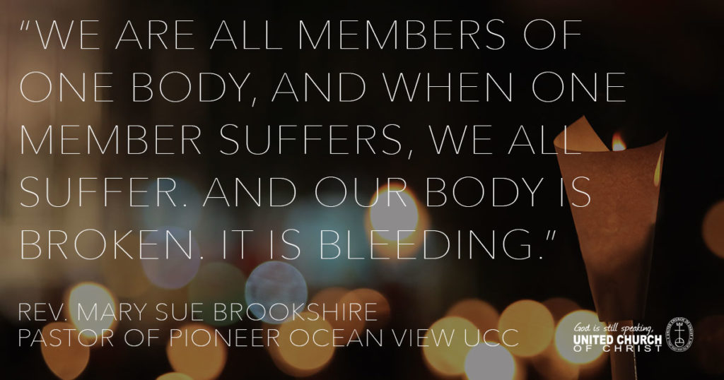 “El Cajon is only about five miles from me. This is my community. I wanted to be there,” said the Rev. Mary Sue Brookshire, pastor of Pioneer Ocean View UCC. ‘”I am worried that in our nation, we are missing the message of the #blacklivesmatter movement. After one of these shootings, which are becoming far too common, we sift through the details to find out if it can be ‘justified’ or not. But there is a much larger message that we are missing. One of the men at the press conference Wednesday said, ‘I am armed right now. I am armed with the melanin in my skin. When police see me, they see someone armed and dangerous. ‘”