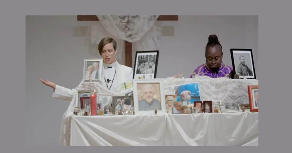 In the service, congregants were invited to offer photos of beloved people who had died, like they do at each year’s All Saints worship. But this time they also brought forward sacred items – clay marbles, tobacco, cotton – representative of the names called. These were prepared and blessed by artist Jessica Valoris.
