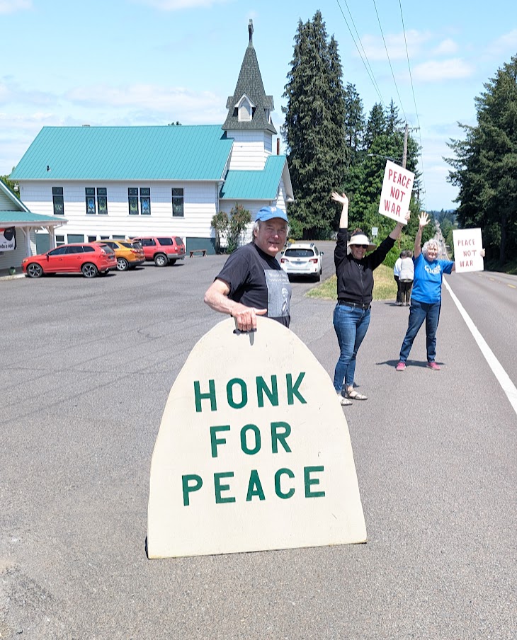 Conkey said, “We had a peace protest scheduled in our parking lot that Saturday morning, and when people arrived they found the damage. So, they swept up some of the glass, and went out to the parking lot with their signs. We weren’t going to let that stop us.” The church had been targeted in the past–their signs and banners had been damaged, but they just keep repairing them and putting them up.