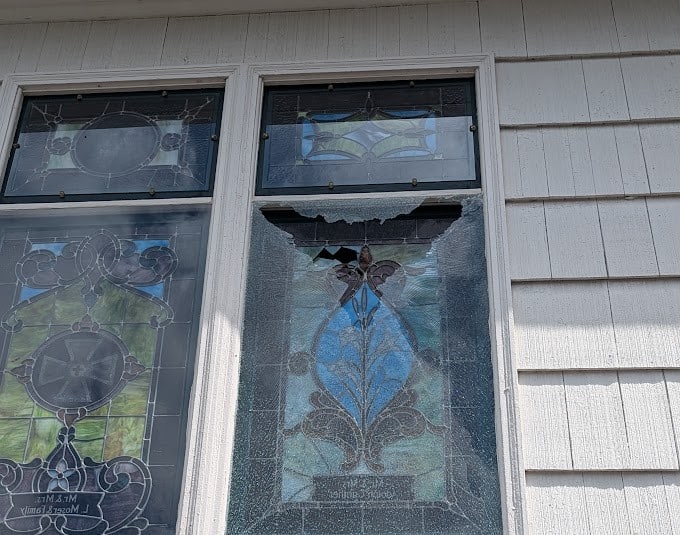 Security video shows a car pulling up to the church around 9 p.m. on June 13, and a shadowy male figure can be made out but not clearly identified. “Someone intentionally threw bricks and rocks at these windows, breaking the plate glass that protected the stained glass, but also causing some damage to the historic windows themselves,” said Conkey. “The windows orginally came from a church in Germany in the 1800s, and they are now being repaired.”