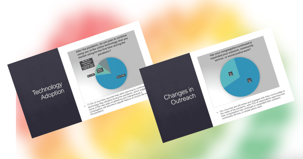 - 78 percent said they “plan to continue using the online technology they adopted during the pandemic beyond the pandemic,” she said. “This suggests that our online gatherings will become a regular feature of church life going forward, whether that is online worship, Bible studies, council meetings or outreach.”