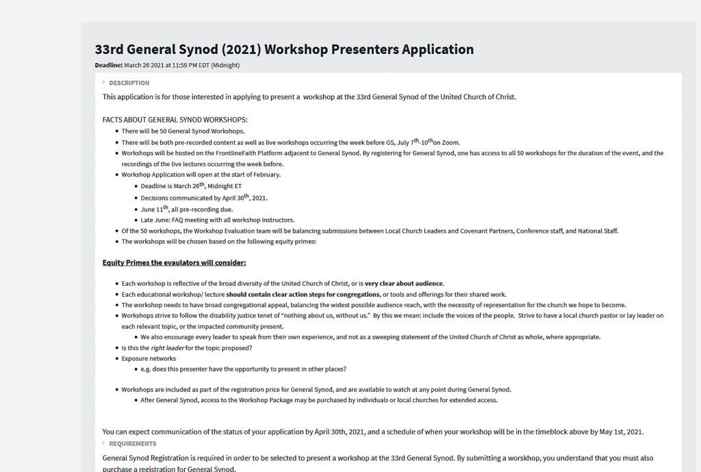 Davies said the committee seeks workshops that “reflect the United Church of Christ as it is, and equip us as we continue to live into our discipleship in Christ, the values of the United Church of Christ, and a just world for all.”