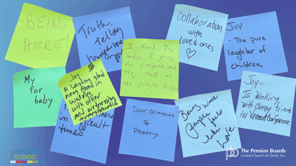 Attendees descending onto the Kansas City Convention Center in Missouri were invited to The Pension Boards booth in the exhibit hall. There they had an opportunity to reflect on the themes of hope, peace, joy and love. Each theme was displayed on large boards. Colorful sticky notes were provided to write down thoughts and prayers. The notes were then displayed with its corresponding theme.