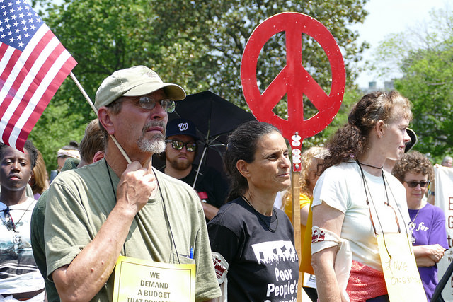 Thankfully, there is a movement happening which is helping articulate just what such a different world could look like. The new “Poor People’s Campaign” is renewing Dr. King’s movement from the 60’s, and focusing on its inherent intersectionality, or what Rev. William has called “fusion politics.” This fusion movement on Tuesday gathered hundreds outside the Capitol to lift a moral voice on issues of “Militarism, War Economy, Veterans, Education and Our National Priorities.” Speakers called on us to transform our ‘war’ economy into a ‘peace’ economy, and challenged the immorality of profiting from war. One veteran spoke of his path to the military through the “poverty draft” and the continued reality of poverty for many veterans after their service.