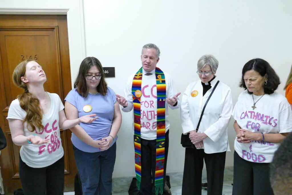 An interfaith coalition of leaders and advocates came together on May 13-14 to pray and sing for members of Congress as they walked to the committee hearings where Congressional committees considered the cuts to Medicaid and SNAP. Wearing homemade t-shirts emblazoned with “UCC for healthcare,” “Catholics for Medicaid,” “God is watching,” and “Whatever you do to the least of these,” these faith advocates sat in the committee rooms and witnessed as those committees passed legislation that would strip millions of their healthcare and nutrition.
