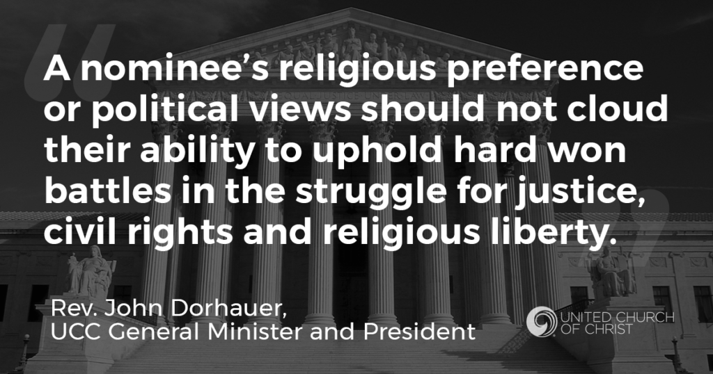 “The slow, painful, and incredibly important work over decades to advance a woman’s right to control her reproductive options is now likely under threat,” said the Rev. John Dorhauer, General Minister and President. “The United Church of Christ will do all it can to protect that, committed to making sure that the advancements made recently in LGBT justice and worker rights, as well as matters related to climate justice, are not threatened by a new justice to the Supreme Court.”