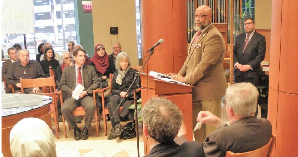 “The United States is an idea, not just a place,” said Moses Timka, M.D., speaking for the Nigerian Community in Greater Cleveland. “There are not many places called ‘United.’ … There are not many places like this country. … We are here to tell the government, in unison with others who are here, to recognize and reconsider their position – that our riches are in our diversity.” Welcoming people from many countries and with many ideas will strengthen the U.S., he said.