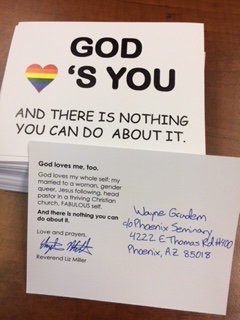 The Rev. Liz Miller, who pastors Edgewood United Church, UCC in East Lansing, decided each and every one of those signers needed to hear from her. So she did some research, and sent them all postcards. Postcards which said, “God Loves You .. God Loves Me too—God loves my whole self: my married to a woman, gender queer, Jesus following head pastor in a thriving Christian church FABULOUS self. And there is nothing you can do about it.”