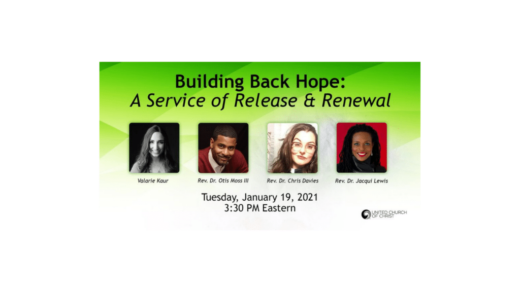 An invitation to one such special worship service describes the current moment as “the intersection of pain and promise.” Titled “Building Back Hope: A Service of Release and Renewal,” it will be held online at 3:30 p.m. ET Tuesday, Jan. 19. Presented by the national ministries of the UCC, it is open to the public. People can register here.