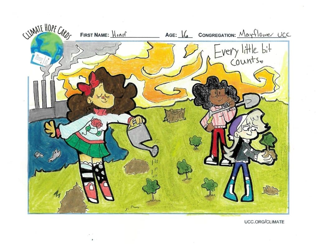 The contest will accept art submissions from March 1 to April 16. An online award ceremony for finalists will be held on May 4, and the winning art will be featured on “Climate Hope Voter Pledge Cards,” which church members throughout the UCC will be encouraged to collect during the summer and fall before Election Day.