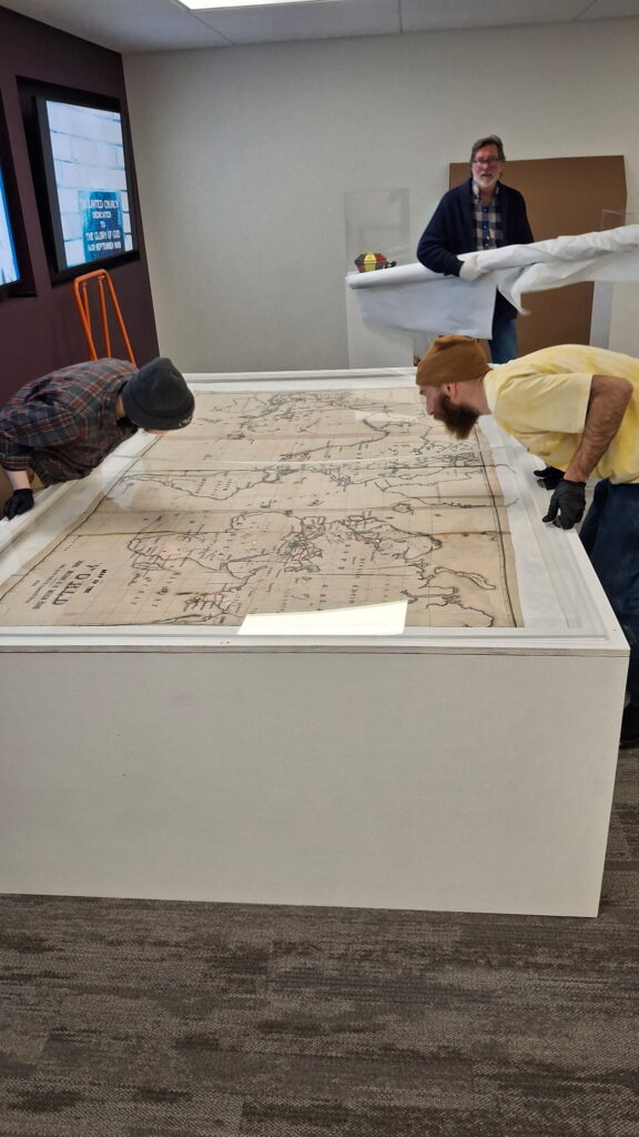 As the “what next” question rolled around in Cade’s head, the archivist came across several 19th century maps — all printed on cotton fabric. But it was the 1884 world mission map that excited him the most.