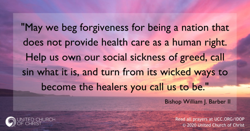 May we beg forgiveness for being a nation that does not provide health care as a human right. Help us own our social sickness of greed, call sin what it is, and turn from its wicked ways to become the healers you call us to be.