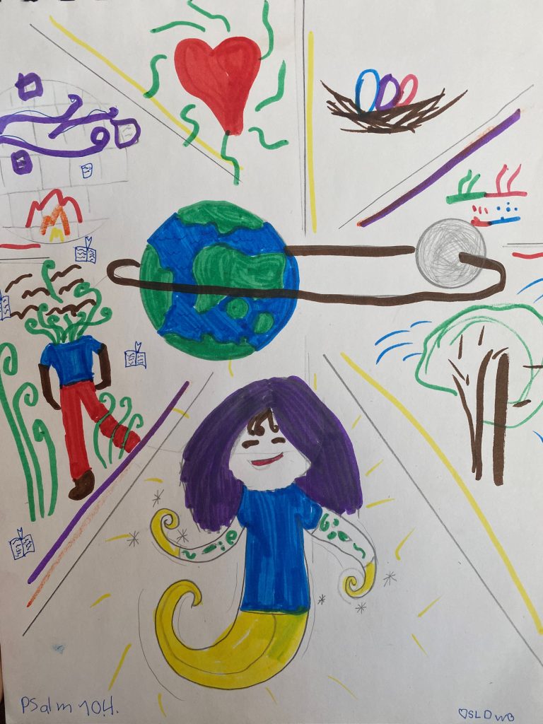 Key: Starting at the bottom at 6 o’clock we have “God wrapped in light as with a garment”; then “You stretch out the heavens like a tent” above her. Clockwise from God: “You make the winds your messengers, fire and flames your ministers”; “Wine to gladden the human heart” “Birds build their nests”; “You have made the moon to mark the seasons”; “The trees of God are watered abundantly”. © 2020 Sasha Lillyana Wispelwey